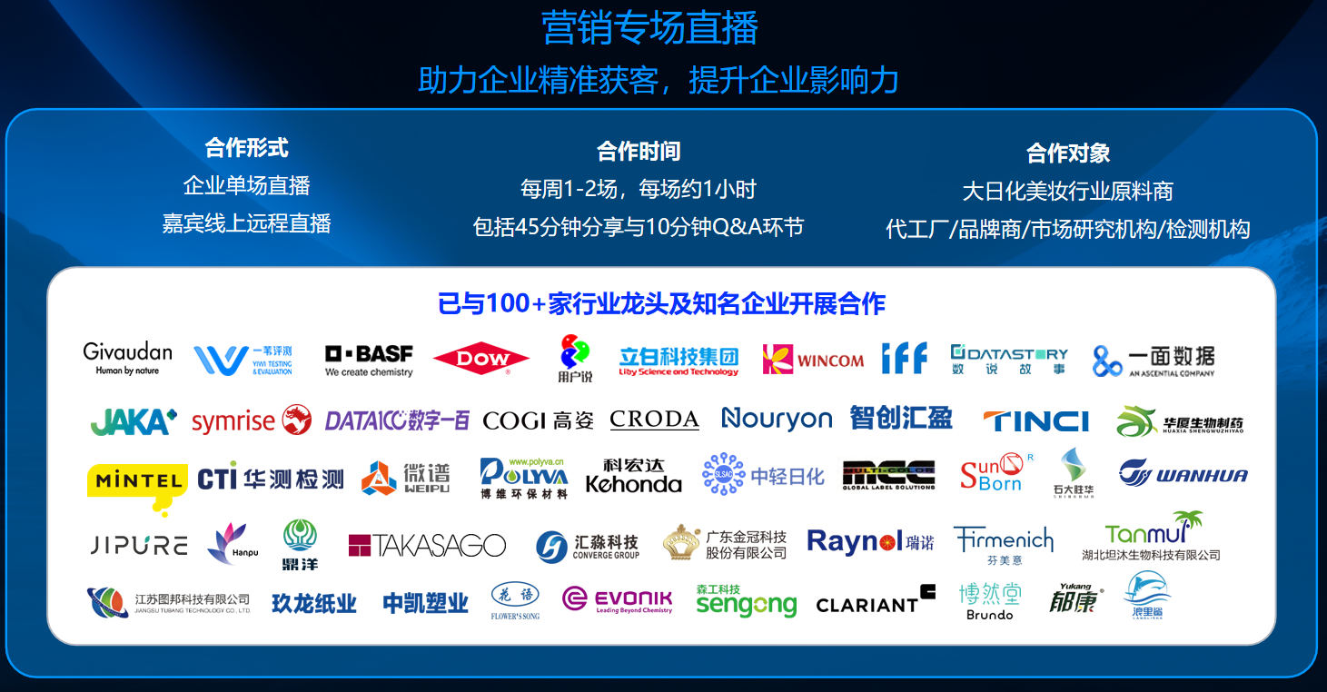目前,日化智云已与100+家行业龙头及知名企业开展专业直播合作,为日化美妆行业企业和从业者带来原料行情、原料应用、产品研发、配方设计、产品策划、市场趋势、功效评价等日化美妆行业知识干货,提供产品创新启发,挖掘消费需求,助力品牌商、代工企业把握市场机遇。如果您是原料商、代加工工厂、品牌商、功效检测机构、市场分析机构等,有新品开发或直播合作等需求,日化智云平台诚邀您的入驻!